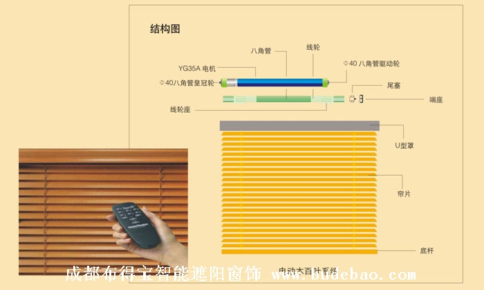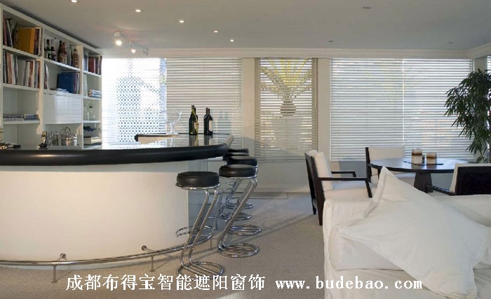 动带动叶片升降代替传统百叶帘手拉的传动方式,具有突破性的创新,使其在操作过程中更加简便和随心所欲。帘片由铝材、木材或PVC等材料制作而成,通过电机的正反转带动帘片自动翻转,能够更加精确的调节室内的自然采光程度,根据