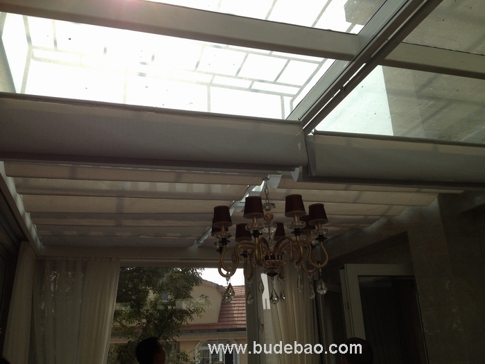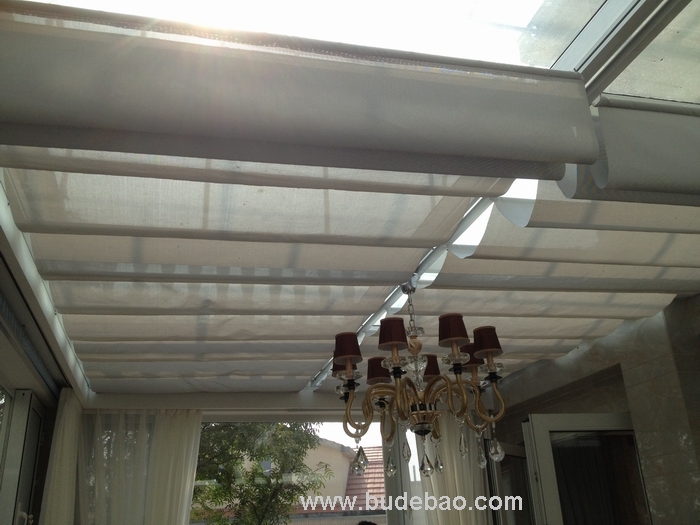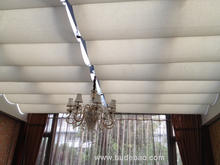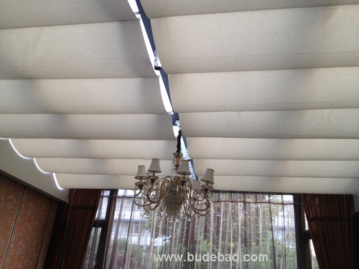 7、效果:天棚帘完全展开后,面料呈现均匀的波浪或水平效果;